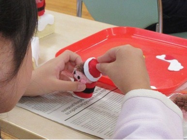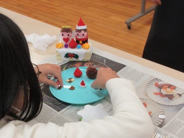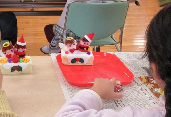11月9日(日)日本ぬいぐるみ協会の皆さんにご指導していただき、とてもかわいいクリスマスケーキのマスコットを二つ作りました。大きなショートケーキの上にはサンタさんと天使が、小さなショートケーキにはかわいい動物がのりました。小さなパーツがたくさんありましたが、みんながんばってしあげました。小さなショートケーキは病院に入院しているお友達やグループホームのお年寄へのプレゼントとして寄付しました。参加してくださったお友達みんながサンタさんになりました。