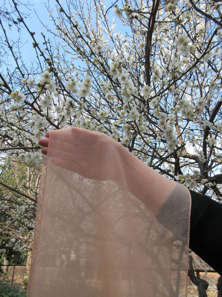 2月18日(水)初めての草木染~梅染めのストールを開催しました。まずは平安時代から伝わる染めの奥深い話、また染めのメカニズムについて学びました。今回は紅梅から色をいただいてシルクストールと綿のタオルハンカチを染めました。ゴツゴツの枝から出した染液で、なんとも優しい桃色に染まりました。