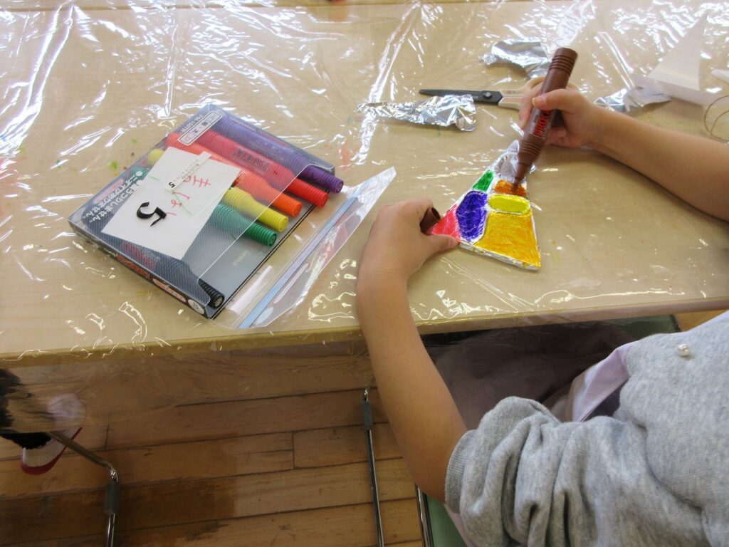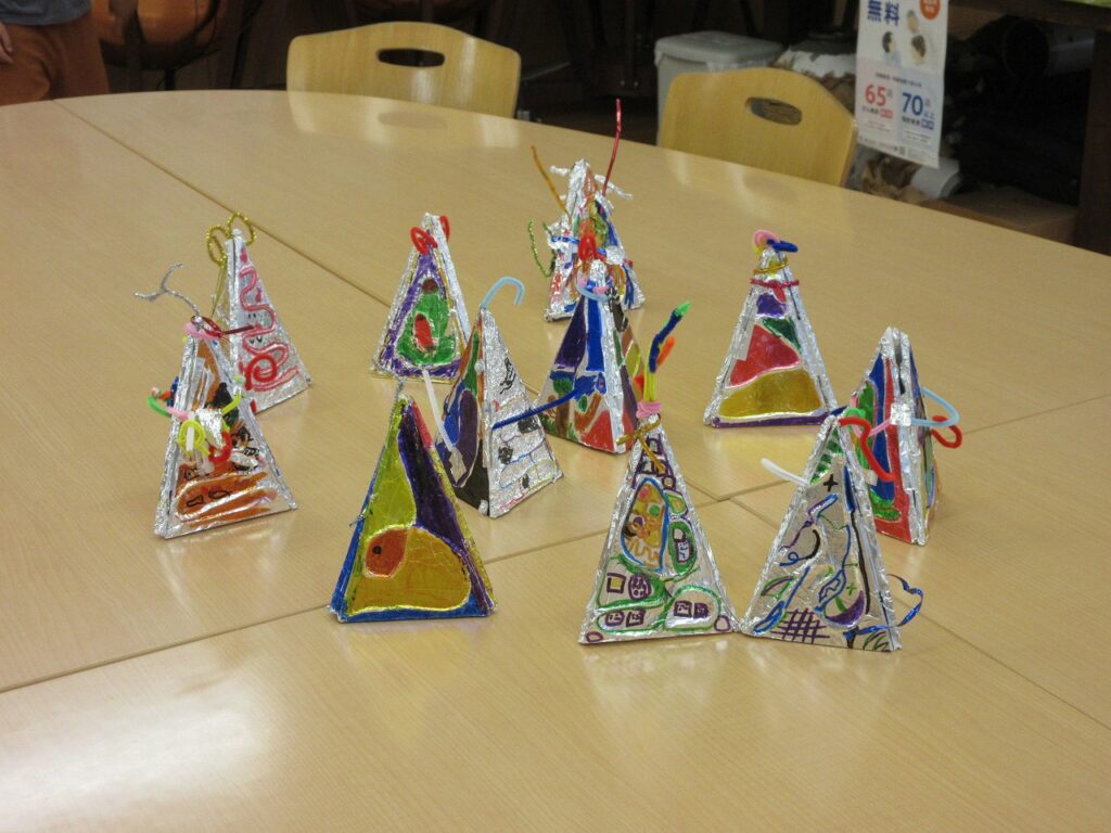 三角形のパネルに、アルミ箔を貼り付け色を付けたものを3枚合わせて三角錐を作ります