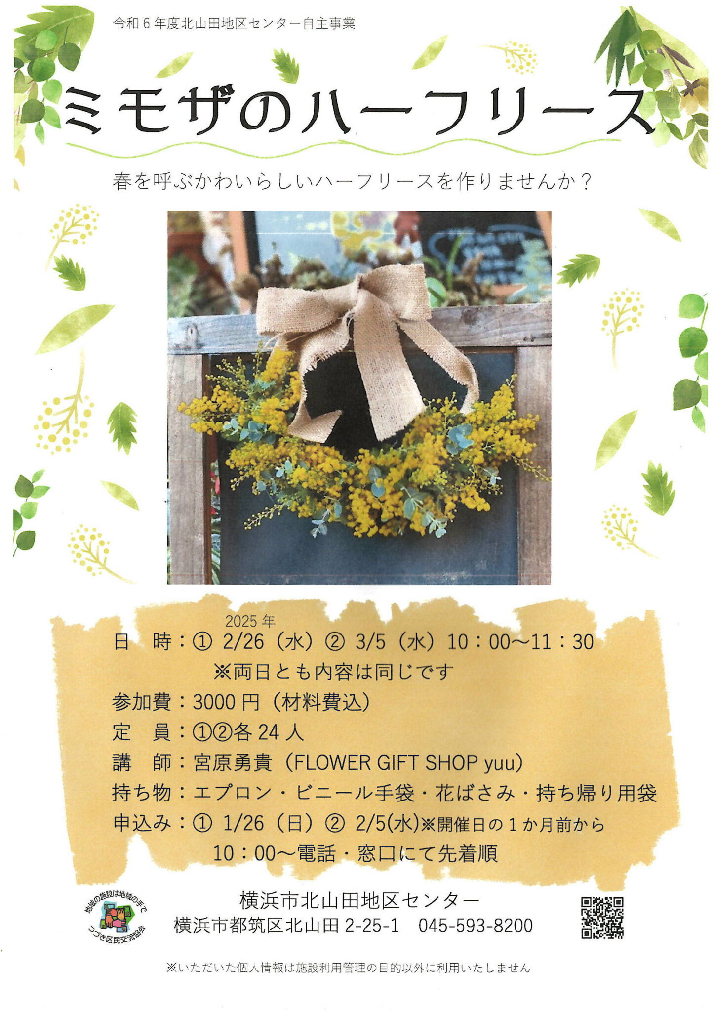 毎年大人気のミモザのハーフリース講座が今年も登場!春を呼ぶかわいらしいリースです。