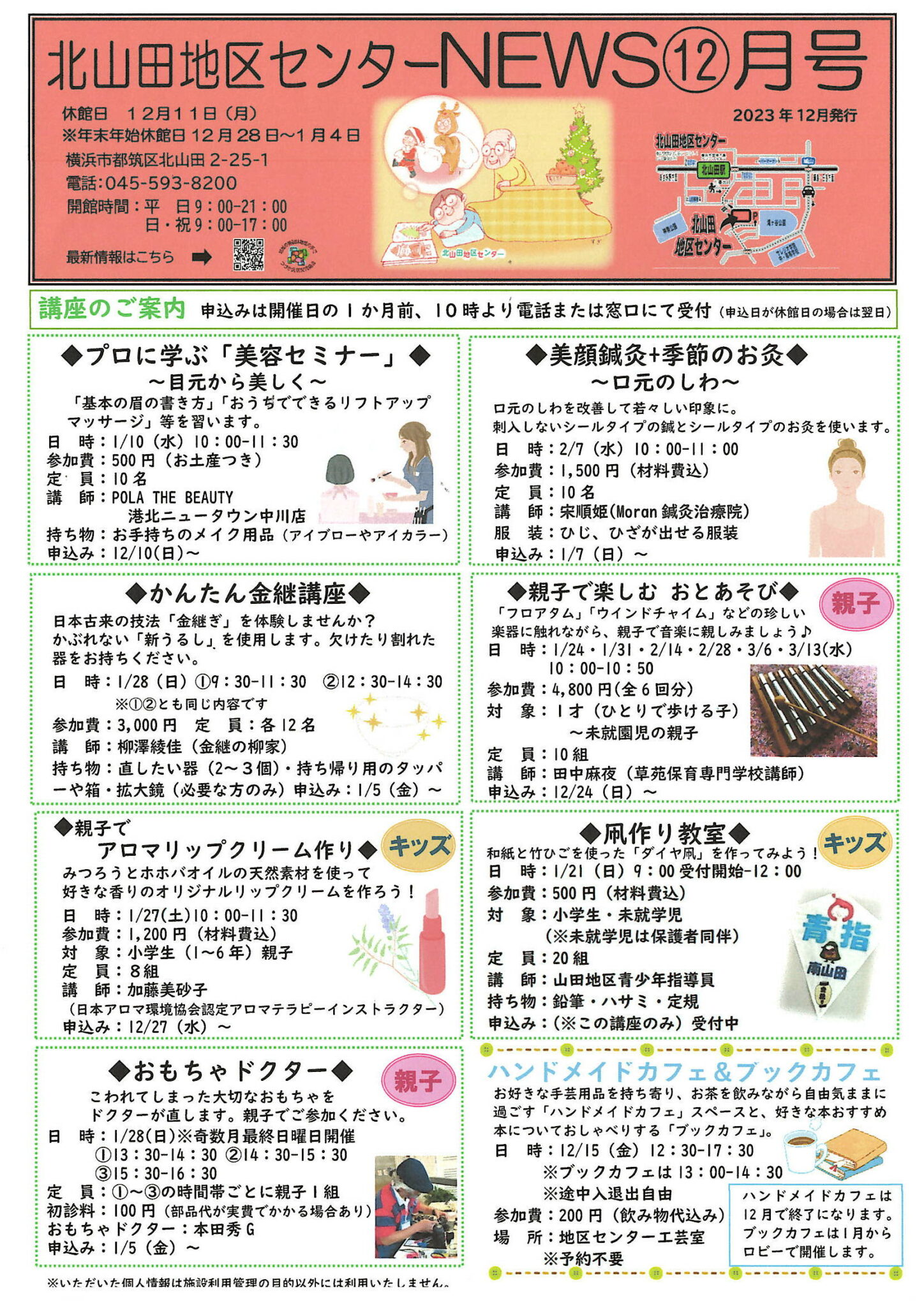 申込みは開催日の1ヶ月前、10時より電話または窓口受付先着順