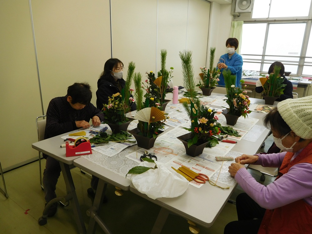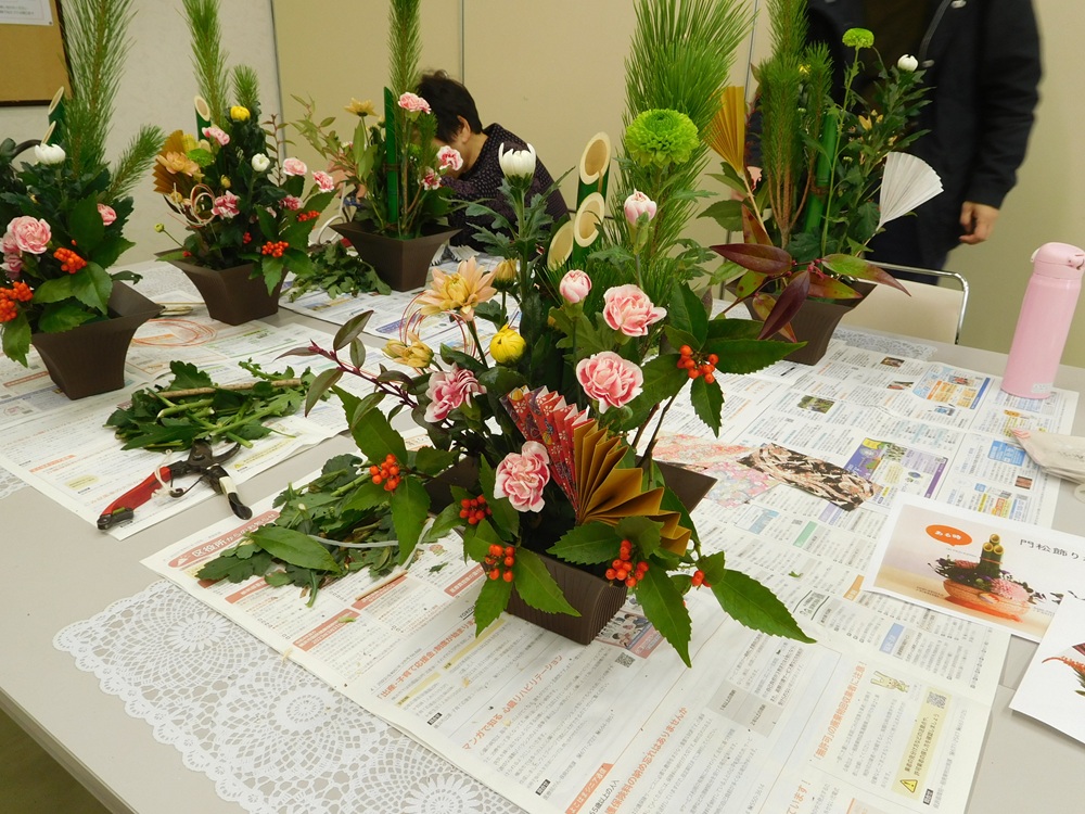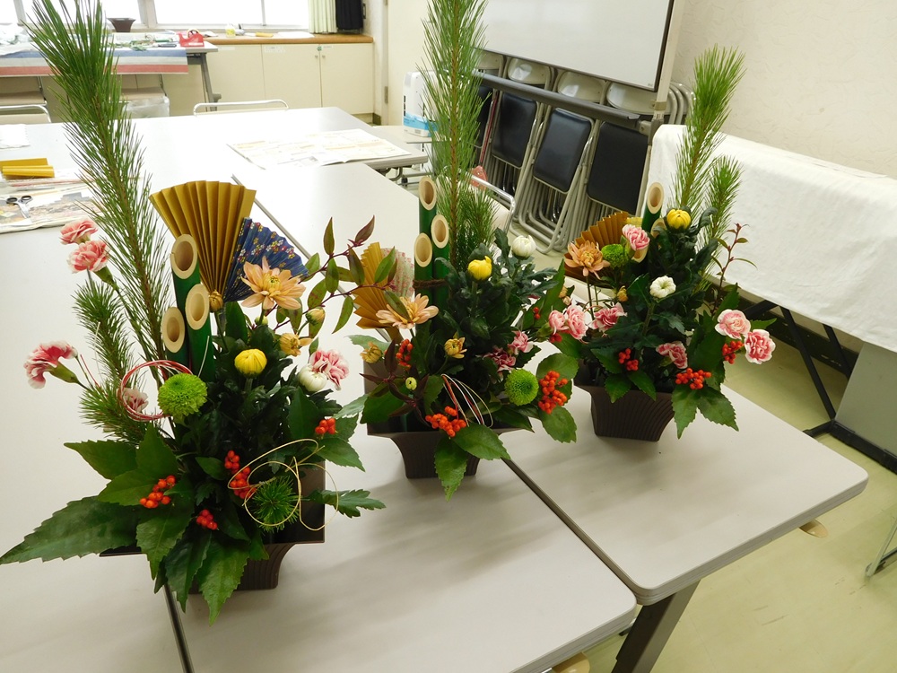 プラスチック製の和風の花器に、お正月といえば松や菊、千両の赤とスプレーカーネーションのピンク色で、彩も鮮やかにそれぞれの趣で仕上げました。