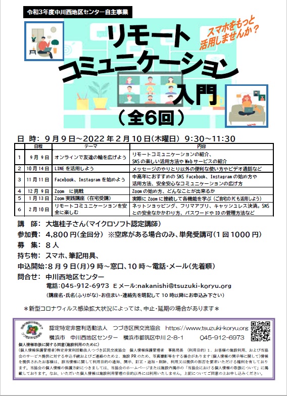 【申込・問合せ】中川西地区センター  電話 045-912-6973・Eメールはこちらから