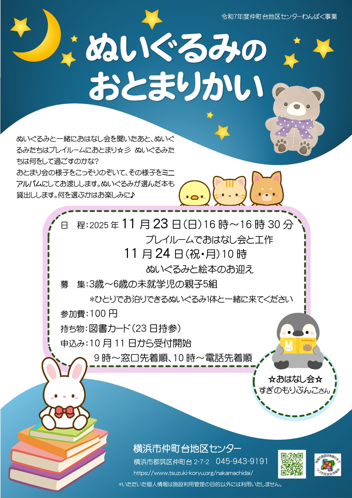 *ひとりでおとまりができるぬいぐるみ1体と一緒に来てください