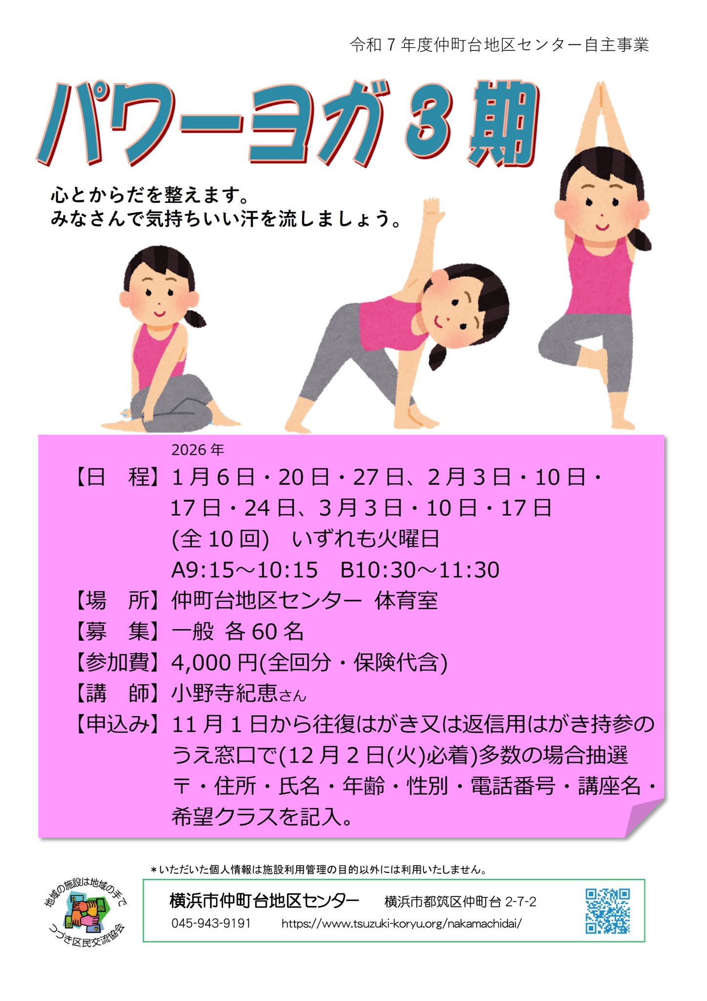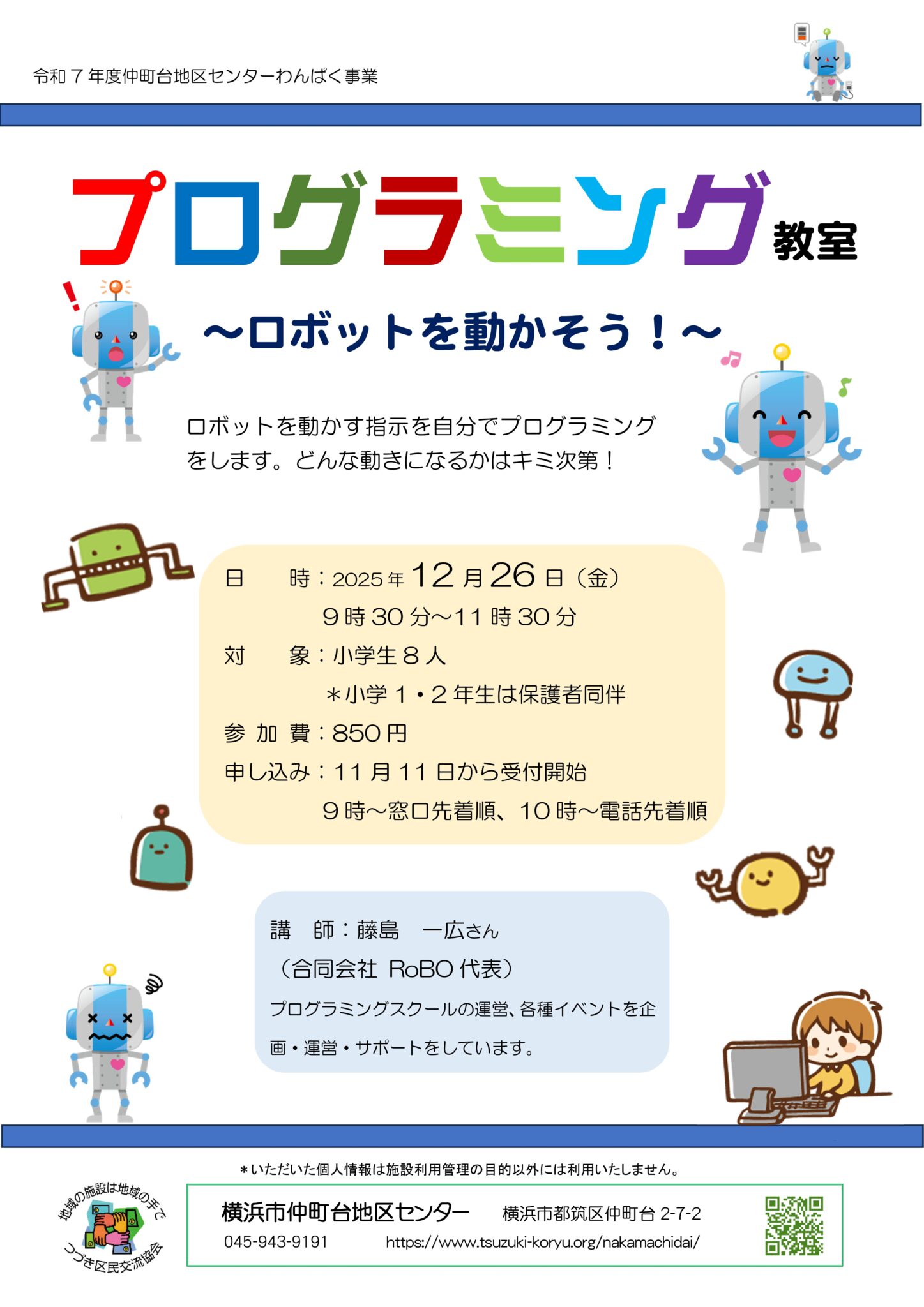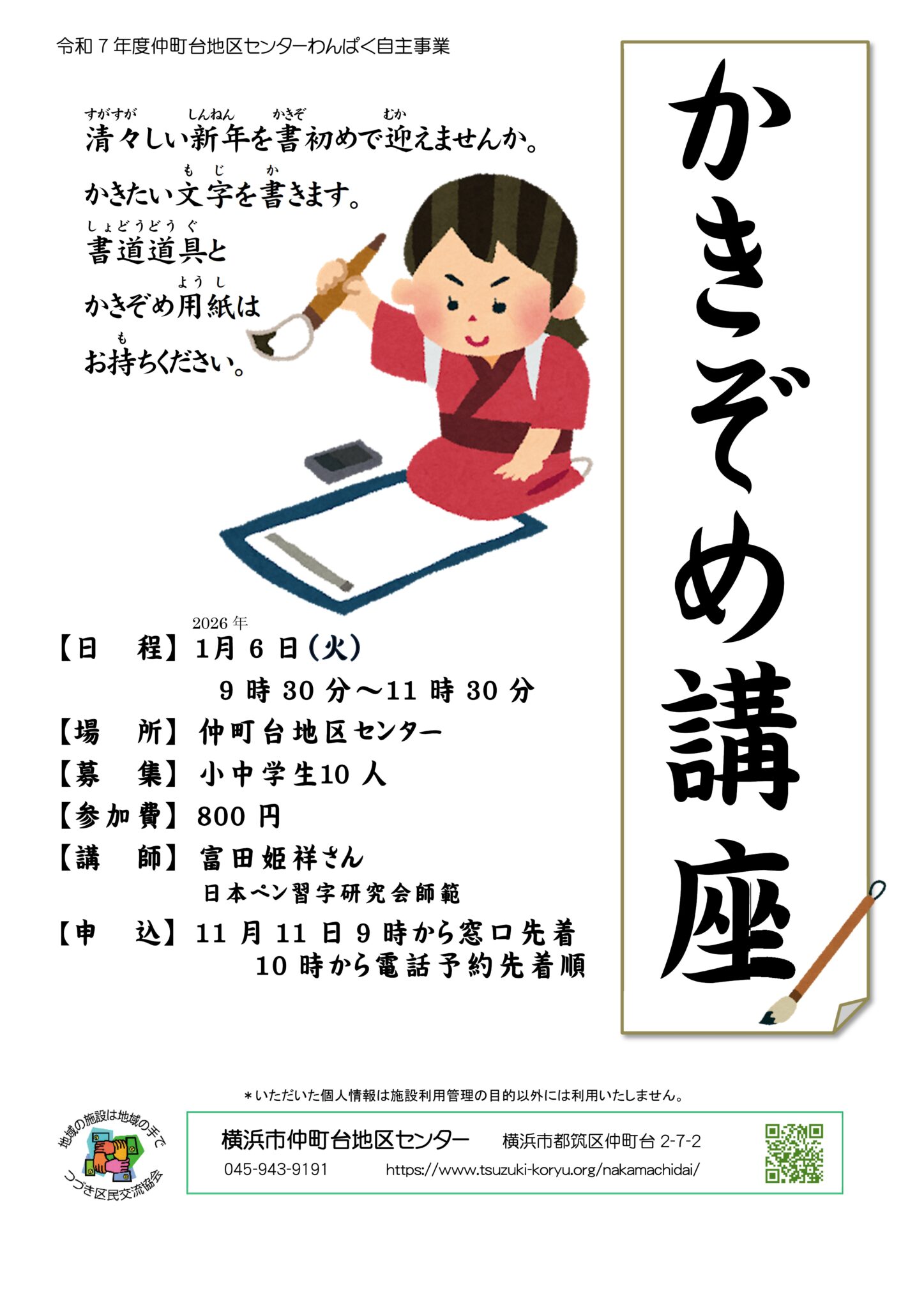 ・申込み:10月1日から10月24日(必着)までに必要事項(郵便番号・住所・氏名・ふりがな・年齢・性別・電話番号・講座名・ご自分のレベル(初心者・初・中・上級者)を受付の申込用紙に記入し、ご自分宛の返信用はがきとともにお申込みいただくか、往復はがきで往信に必要事項、返信にご自分の宛名を書いてご郵送ください。応募者多数の場合は抽選になります。