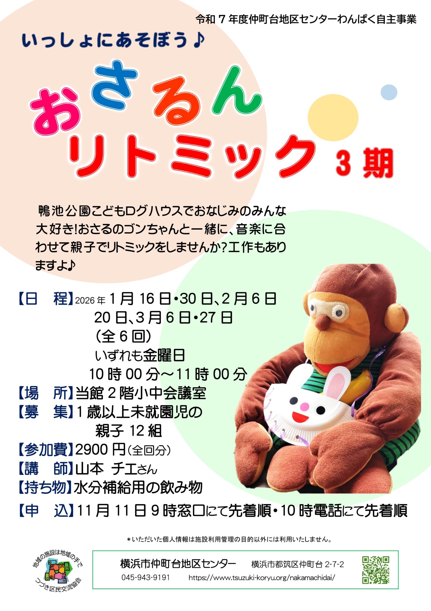 鴨池公園こどもログハウスでおなじみのおさるのゴンちゃんと一緒に、音楽に合わせて親子で楽しみませんか?工作もありますよ