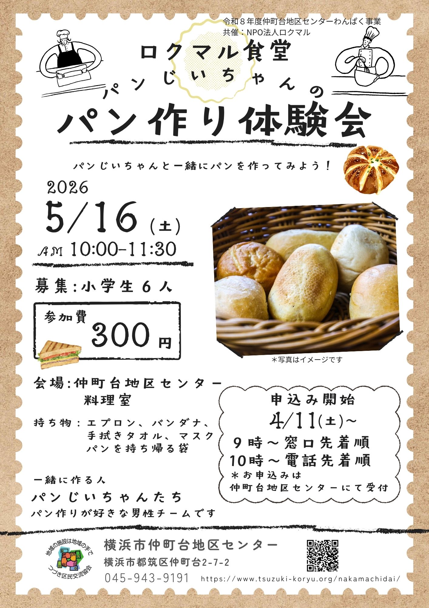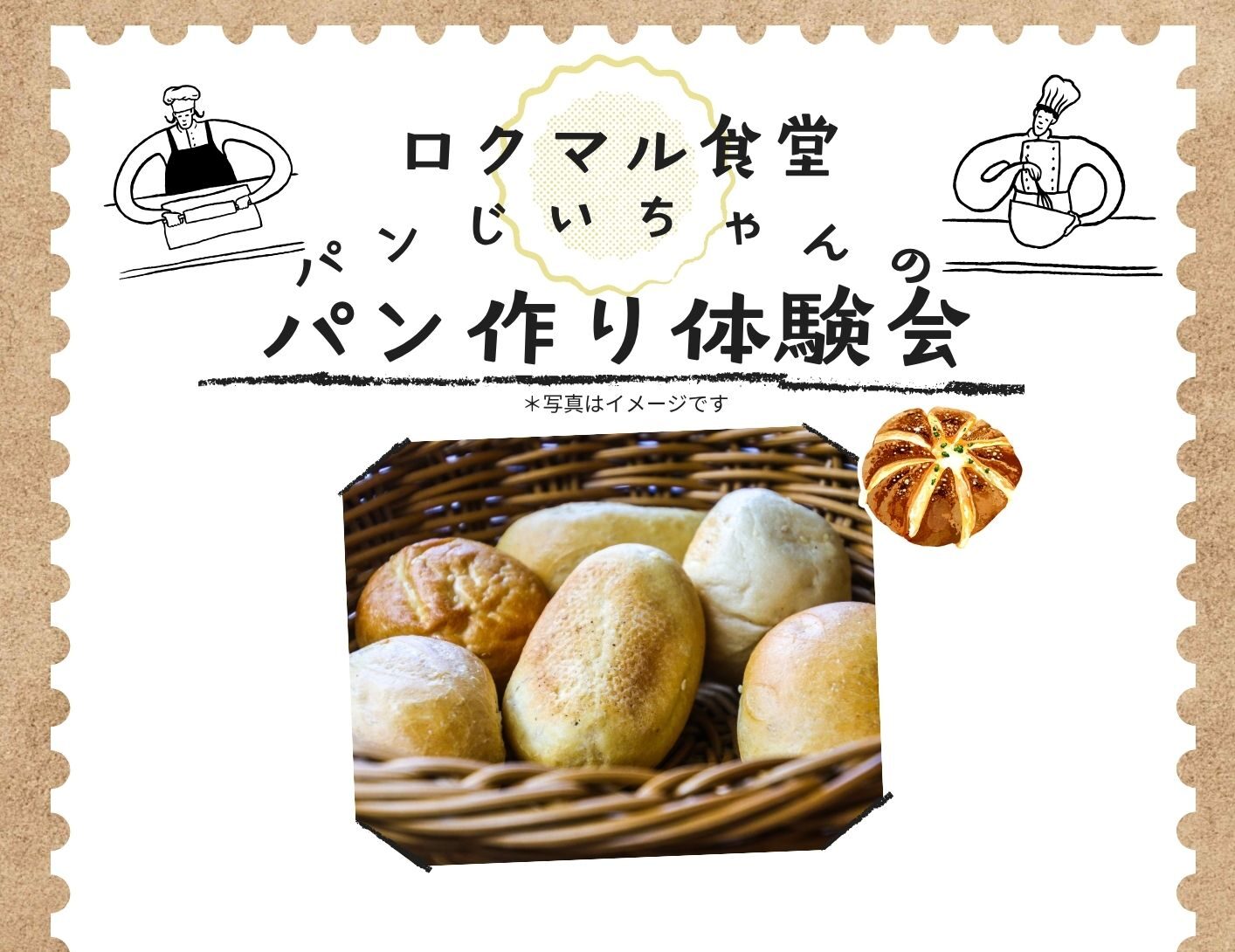 ・持ち物:エプロン、バンダナ、手を拭くタオル、パンを持ち帰る袋