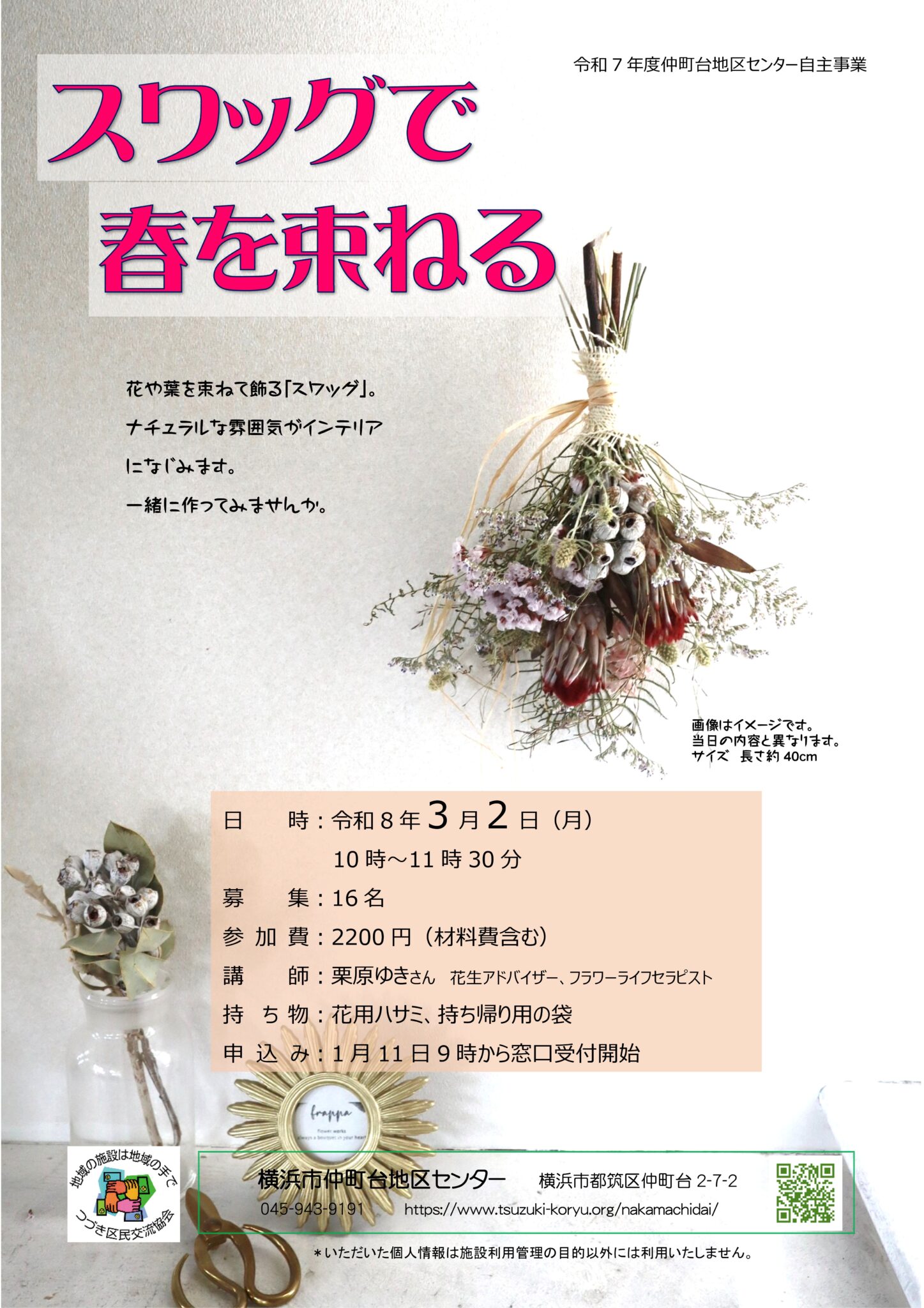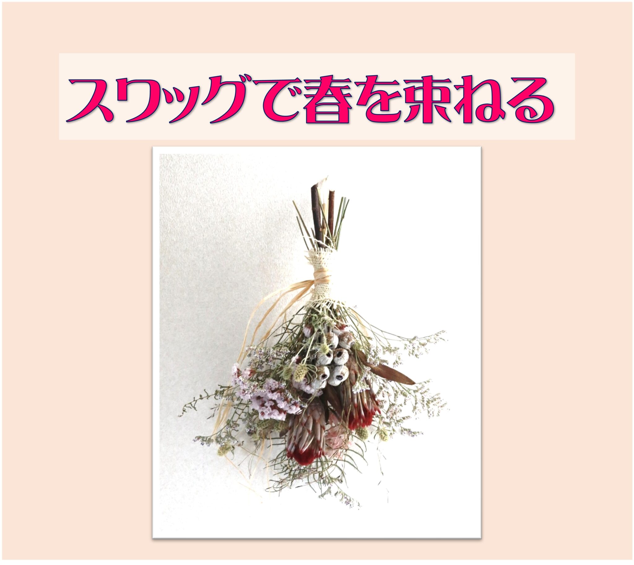 花や葉を束ねて飾る「スワッグ」。ナチュラルな雰囲気がインテリアになじみます。一緒に作ってみませんか。