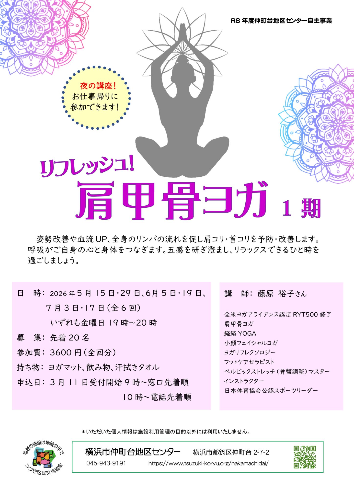 ・講師 藤原裕子さん(全米ヨガアライアンス認定 RYT500修了、肩甲骨ヨガ、経路YOGA、小顔フェイシャルヨガ、ヨガリフレクソロジー、