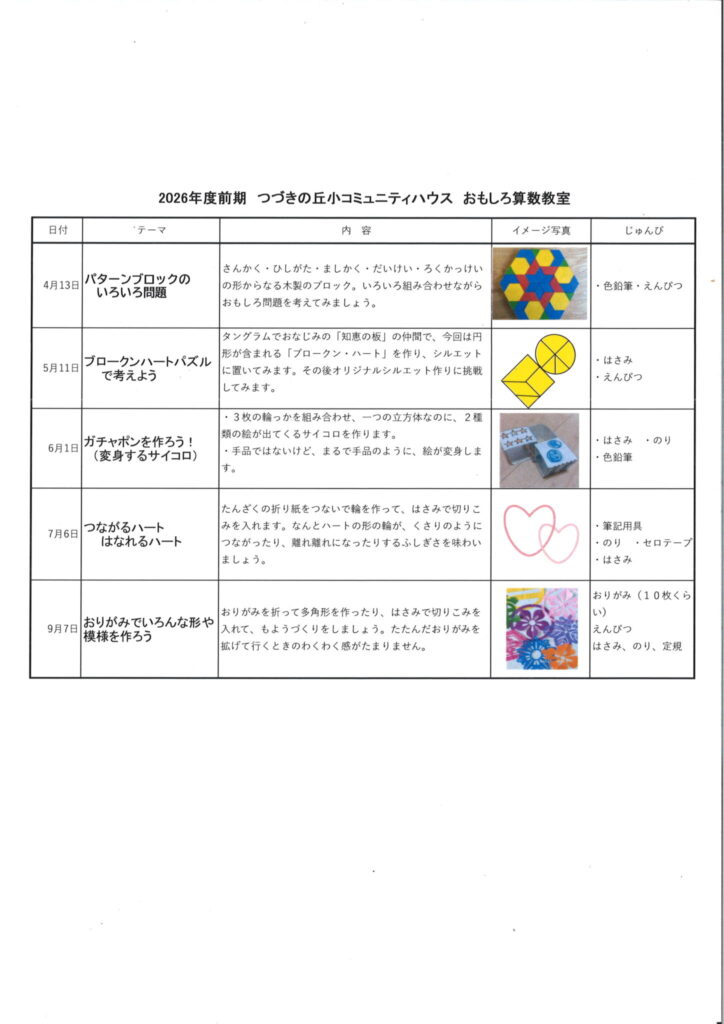 内容:①パターンブロックのいろいろ問題②ブロークンハートパズルで考えよう③ガチャポンを作ろう!(変身するサイコロ)④つながるハート・はなれるハート⑤おりがみでいろんな形や模様を作ろう