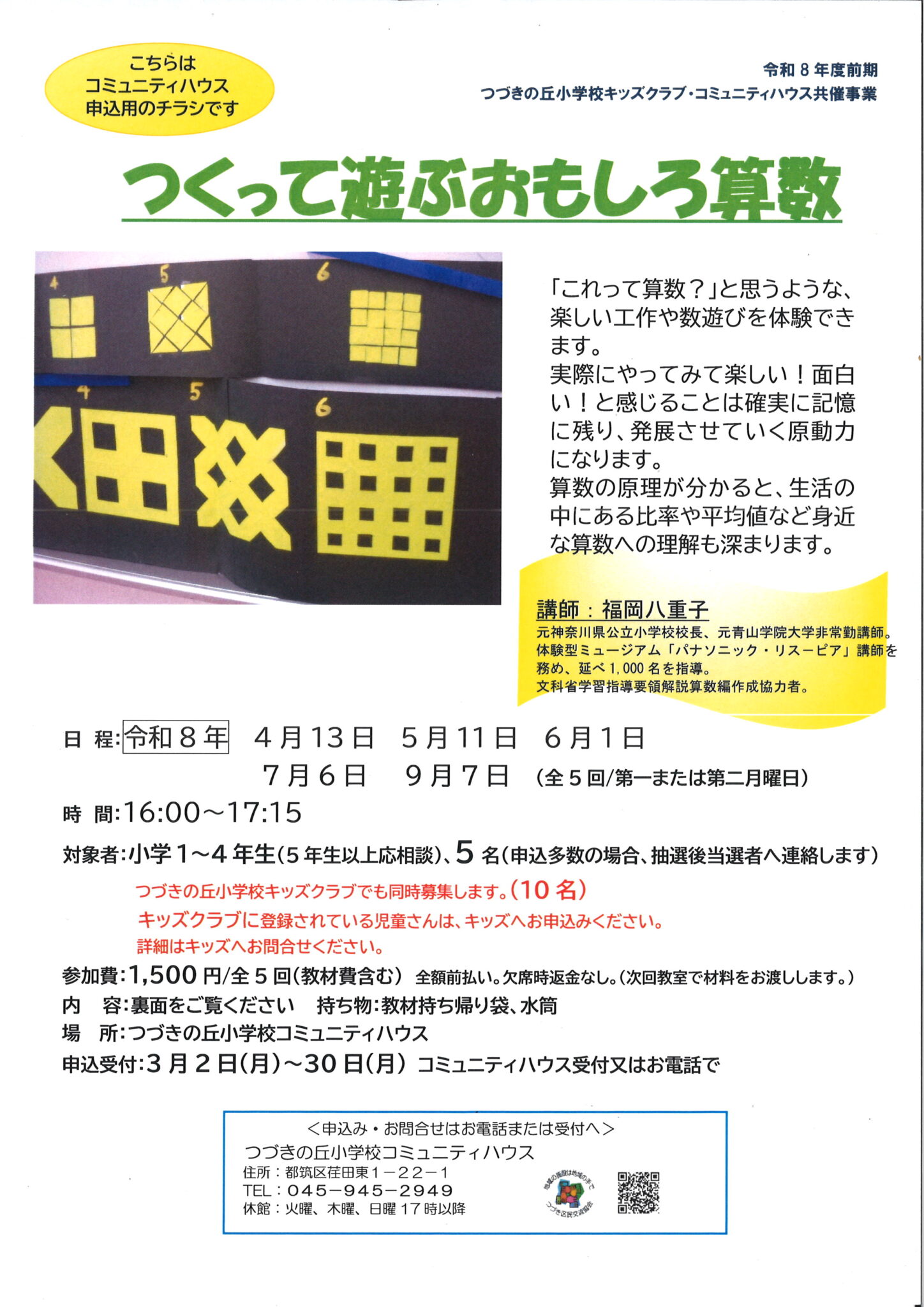 「これって算数?」と思うような工作や数遊びをみんなで体験して遊ぶ教室です。楽しい!面白い!と感じる体験は確実に記憶に残り、自分で学習を発展させていく原動力になります。つづきの丘小学校放課後キッズクラブと同時募集になります。キッズに登録されている児童さんはキッズへお申込みください。ご不明点はお問合せください。
