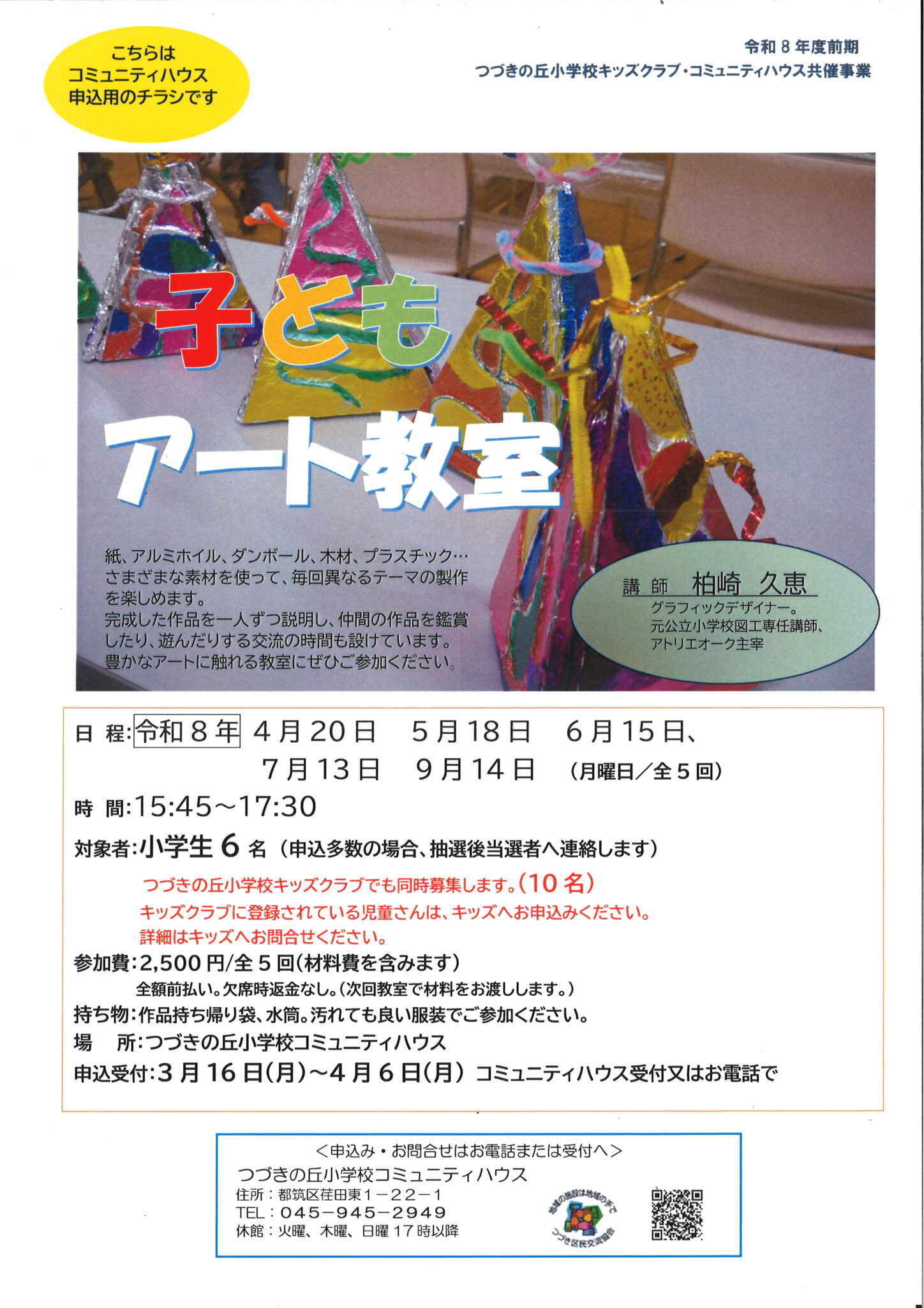 様々な素材を使って、毎回異なるテーマの製作を楽しめます。完成した作品を仲間と鑑賞したり、作品を使って遊ぶ交流の機会もあります。豊なアートに触れる教室にぜひご参加ください。申込多数の場合、抽選後当選者へ連絡します。(先着受付はありません)この講座は、つづきの丘小学校放課後キッズクラブと同時募集になります。キッズに登録されている児童さんはキッズからのお申込みになります。ご不明点はお問合せください。