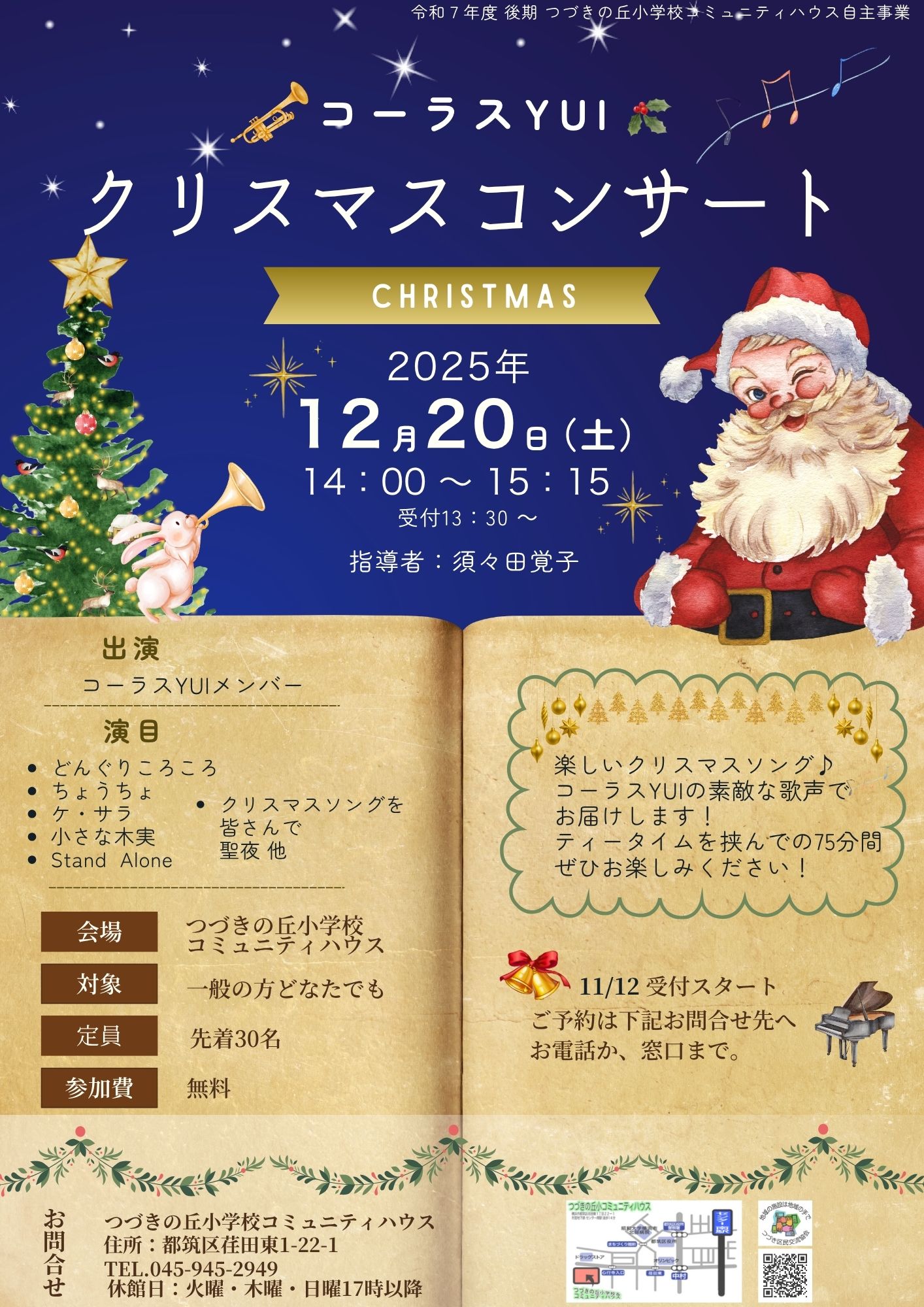 コーラスYUIさんの、心が洗われるようなクリスマスソングを聴きにきませんか?コーラスのワークショップもあります。一緒に歌ってクリスマス気分を盛り上げましょう!