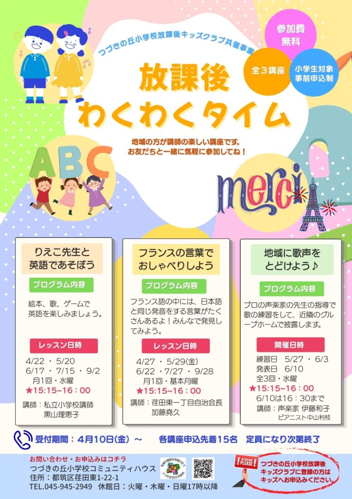 この春から、つづきの丘小学校放課後キッズクラブと共催で、小学生向けの教室と講座を3つ新規開催します。放課後の時間に地域の先生と楽しく学びましょう。全て参加費無料、申込先着15名です。つづきの丘小学校放課後キッズクラブに登録の方はキッズにお申込みください。