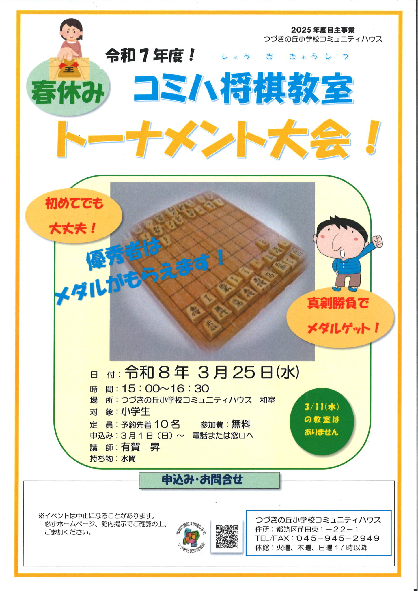 地域の方に教わる将棋教室の春休みトーナメント大会のご案内です。初めてでも参加できます。上位入賞者にはメダル授与。参加賞もあります。