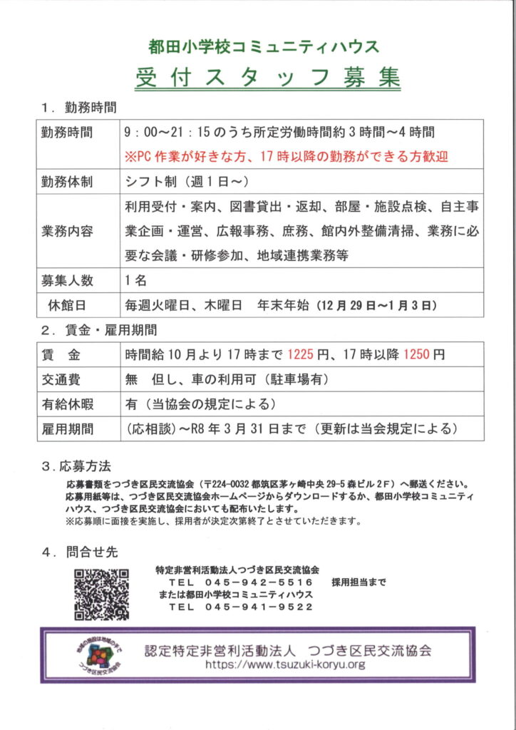 都田小学校コミュニティハウスでは、「受付スタッフ」を募集しています。