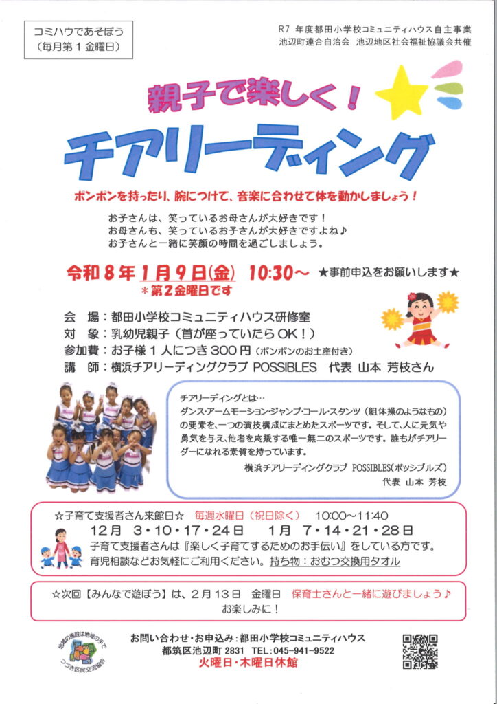 2025年12月05日 1月みんなで遊ぼう『チアリーディング』 「1月は第2金曜日」 1月9日(金)10:30~11:30開催 みんなで遊ぼうは 『チアリーディング』 ダンスができなくても大丈夫!リズムに合わせてママと一緒に体を動かそう🎵